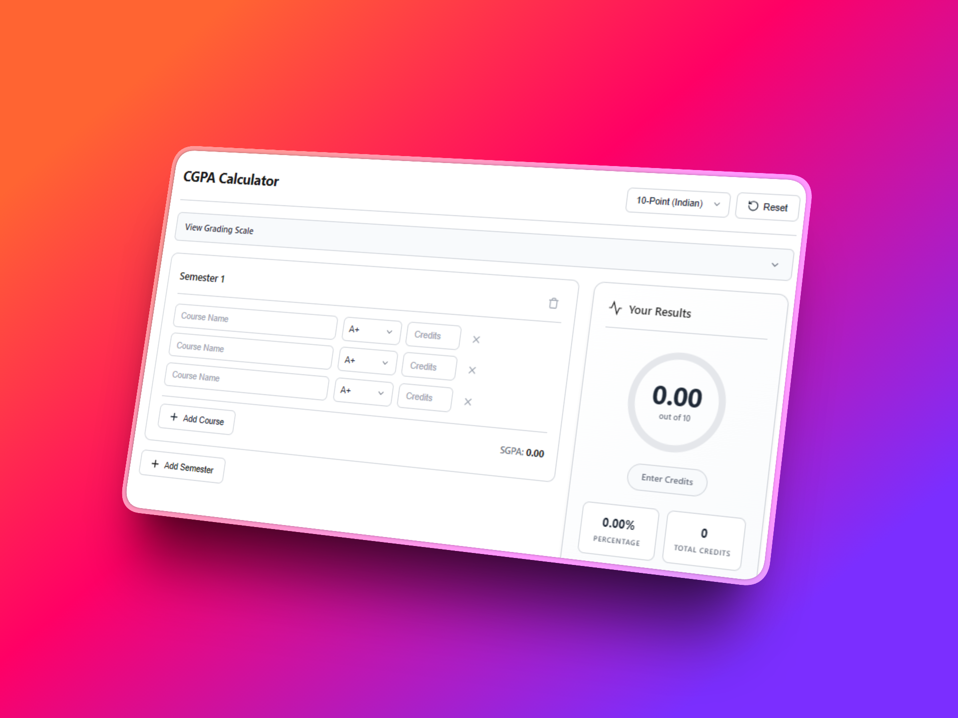 Instantly find your CGPA, SGPA, and GPA with our free, easy-to-use calculator. Supports 10-point & 4.0 scales. Get accurate results and PDF reports