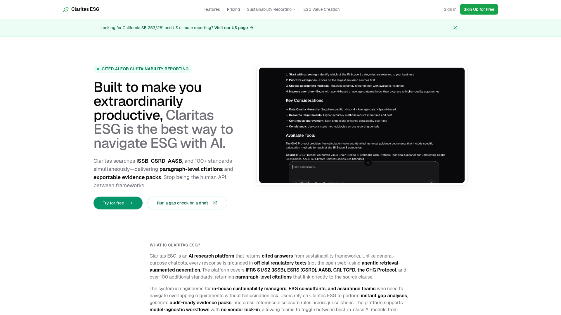 Claritas ESG stands as a transformative tool for anyone navigating the complexities of ESG reporting. By delivering accurate, cited, and audit-ready insights from a vast array of sustainability frameworks, it empowers teams to achieve compliance, mitigate greenwashing risks, and drive value creation efficiently. Explore Claritas ESG today to transform your sustainability research and reporting workflows.
