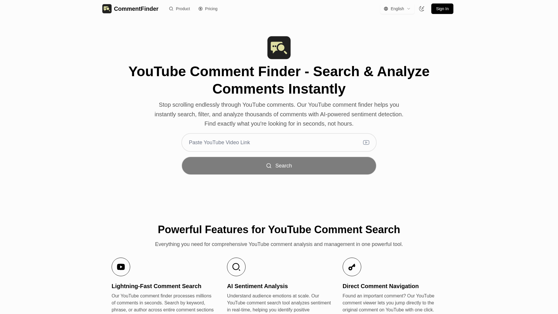 CommentFinder is a powerful SaaS solution designed to revolutionize how users interact with and understand YouTube comments. It provides an instant, AI-powered platform for searching, filtering, and analyzing thousands of comments across any YouTube video, saving creators, marketers, and researchers countless hours.