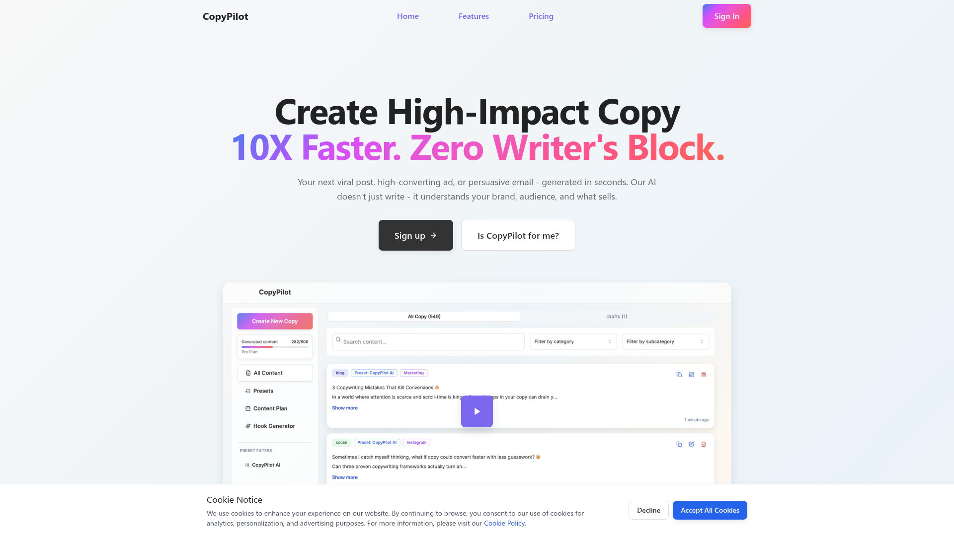 CopyPilot is an AI-powered SaaS platform designed to revolutionize content creation by generating high-impact marketing copy 10X faster. It eliminates writer's block, enabling individuals and businesses to produce viral posts, high-converting ads, and persuasive emails in seconds.