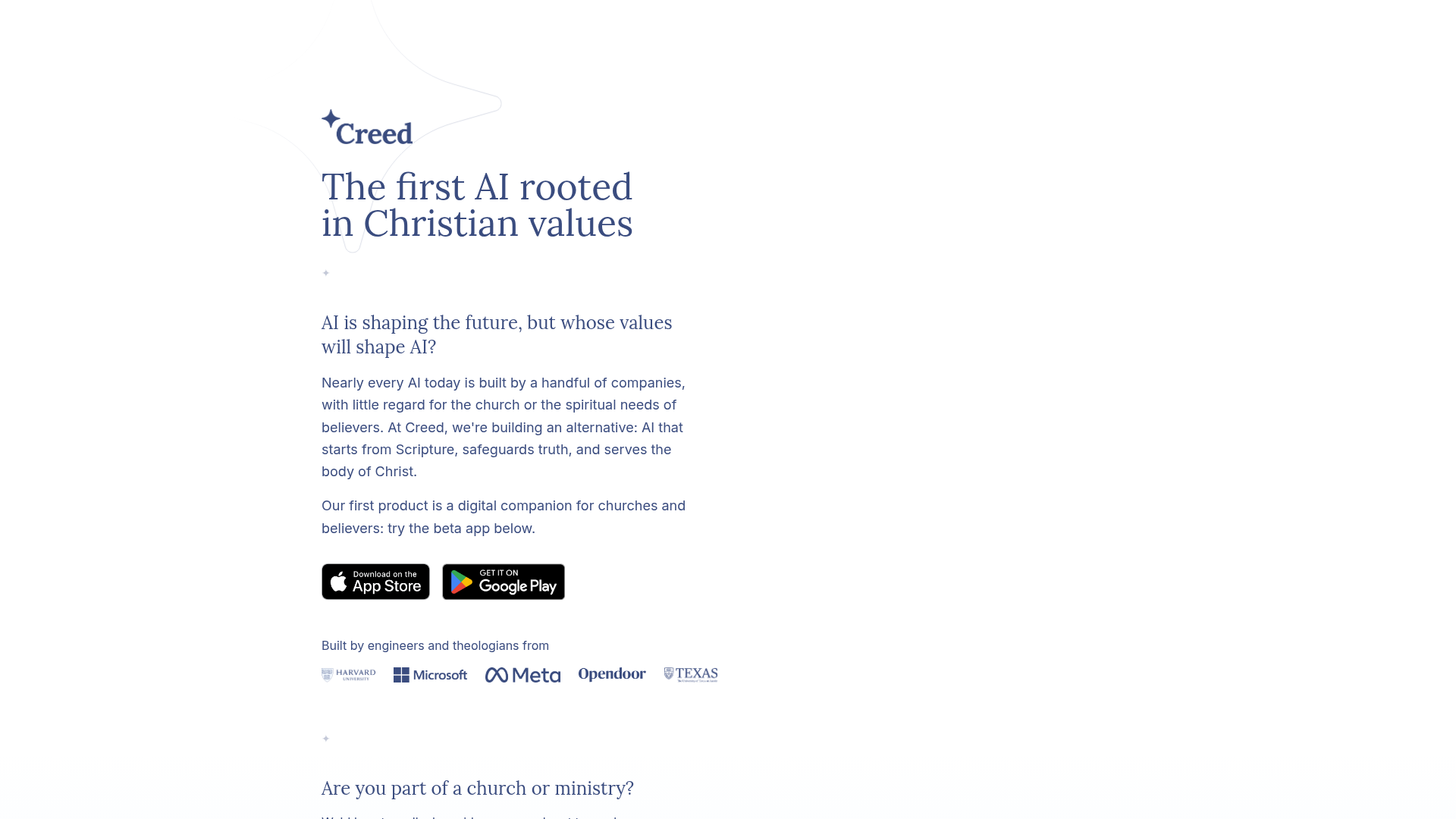 Creed is built by a team of "engineers and theologians," ensuring a blend of technical expertise and deep spiritual understanding. While specific programming languages or frameworks are not disclosed, the product emphasizes its foundation in Christian values and Scripture.