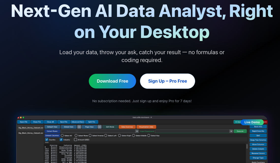 - No-Code AI Data Analysis: Utilize natural language for complex data operations, cleaning, and visualization without writing any code.