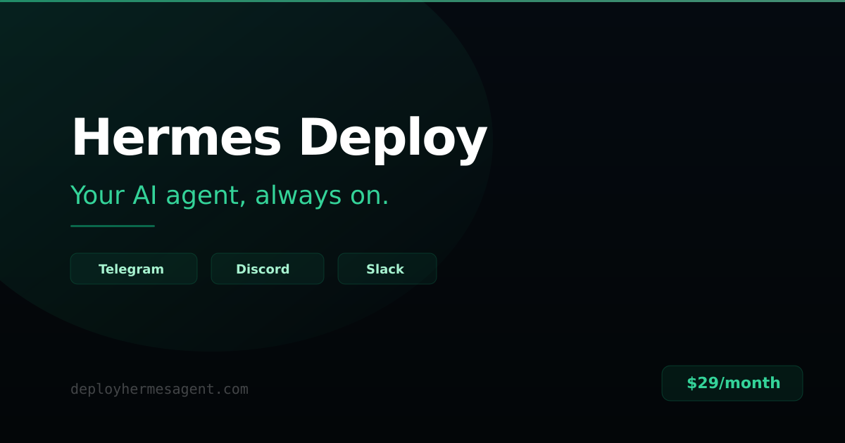 Deploy Hermes Agent in one click. No SSH, no Docker, no config files. You get a dedicated server with Hermes pre-installed and a browser terminal — ready in under 5 minutes. Connect your platforms and go. $29/mo.