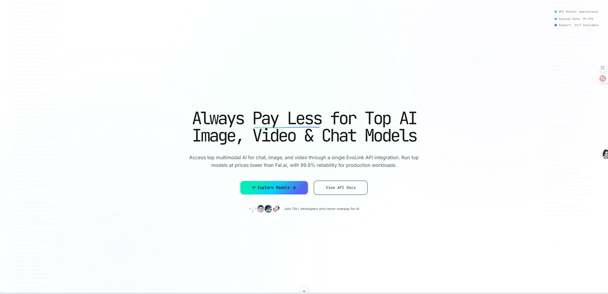 Access top multimodal AI for chat, image, and video through a single EvoLink API integration. Run top models at prices lower than Fal.ai, with 99.9% reliability for production workloads.