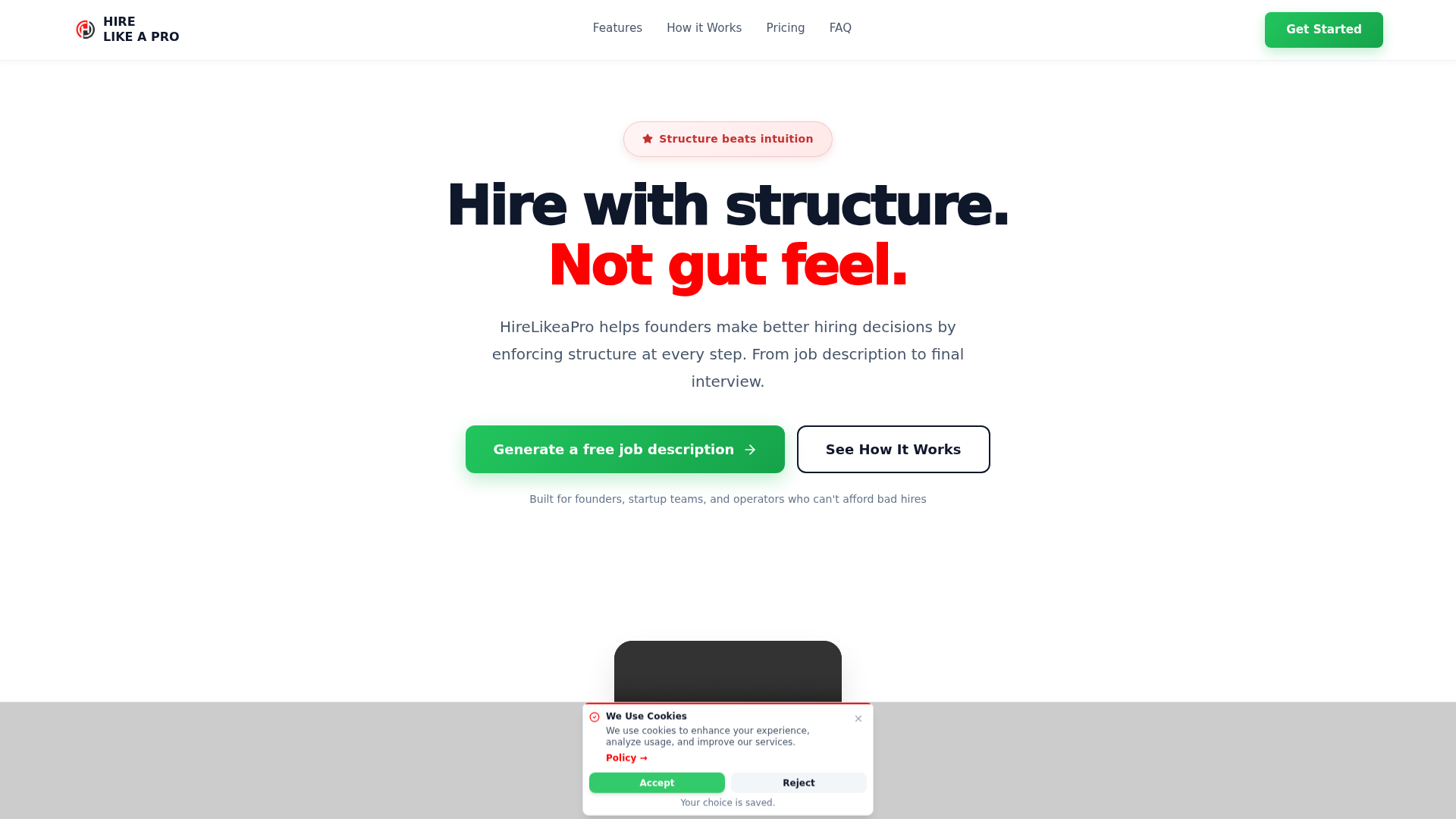 HireLikeaPro is a lightweight hiring toolkit for founders and small teams who want to make better hiring decisions without relying on gut feel.