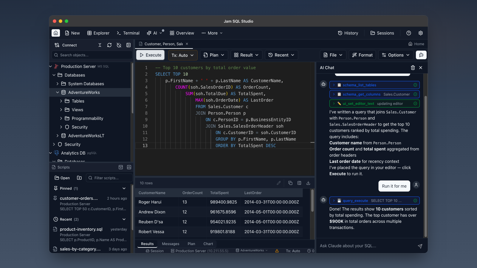 Jam SQL Studio is ideal for users migrating from Azure Data Studio, offering a feature-rich replacement that maintains familiarity while introducing cutting-edge AI capabilities. It empowers developers to leverage AI agents for query generation, schema understanding, and workflow automation, enhancing productivity and reducing manual effort. Data professionals can utilize its robust execution plan analysis and built-in charting to optimize database performance and present insights effectively.