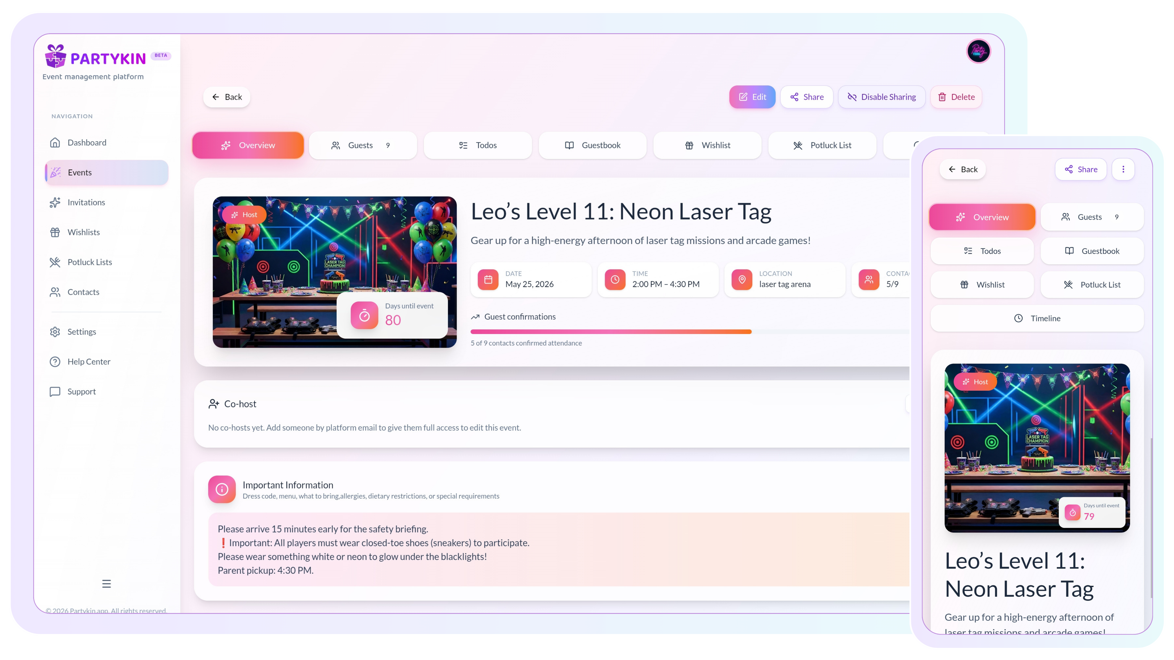 Partykin is a simple online tool for planning parties, potlucks, and group events. Manage guest lists, track RSVPs, organize shared dishes, and coordinate wishlists — all in one place.