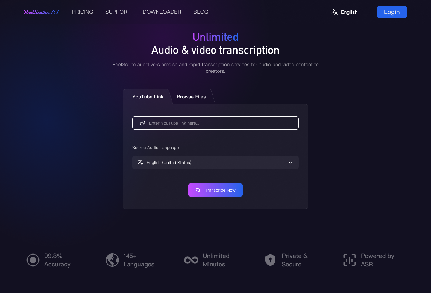 Transcribe videos and audio to text instantly with ReelScribe – the fast, accurate, and unlimited AI transcription tool. Convert MP4, MP3, or any video to text and subtitles in 145+ languages. 99.8% accuracy. Download transcripts as DOCX, PDF, TXT, or SRT.