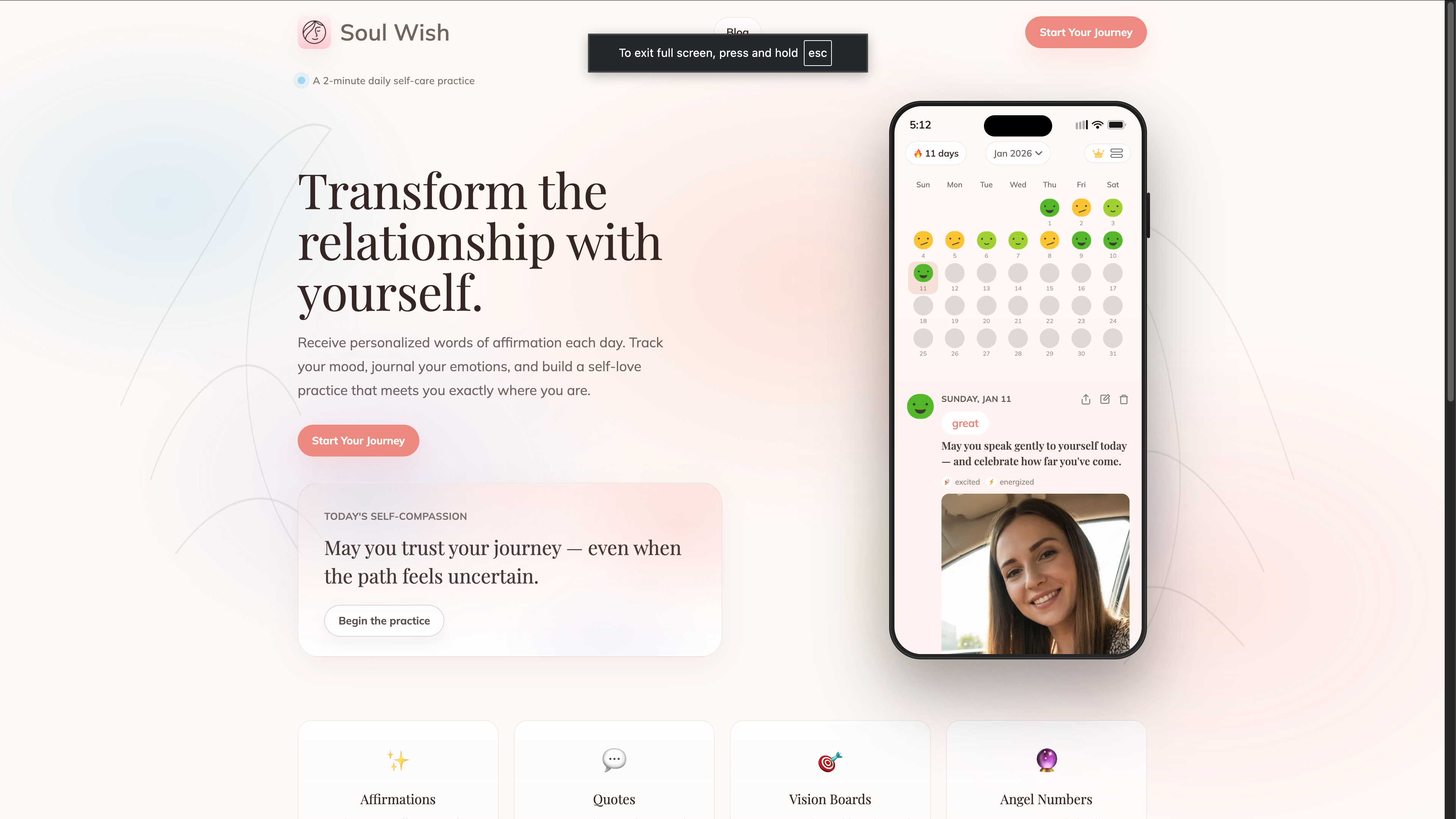 SoulWish is a daily emotional wellness app that combines mood tracking with personalized audio affirmations.
