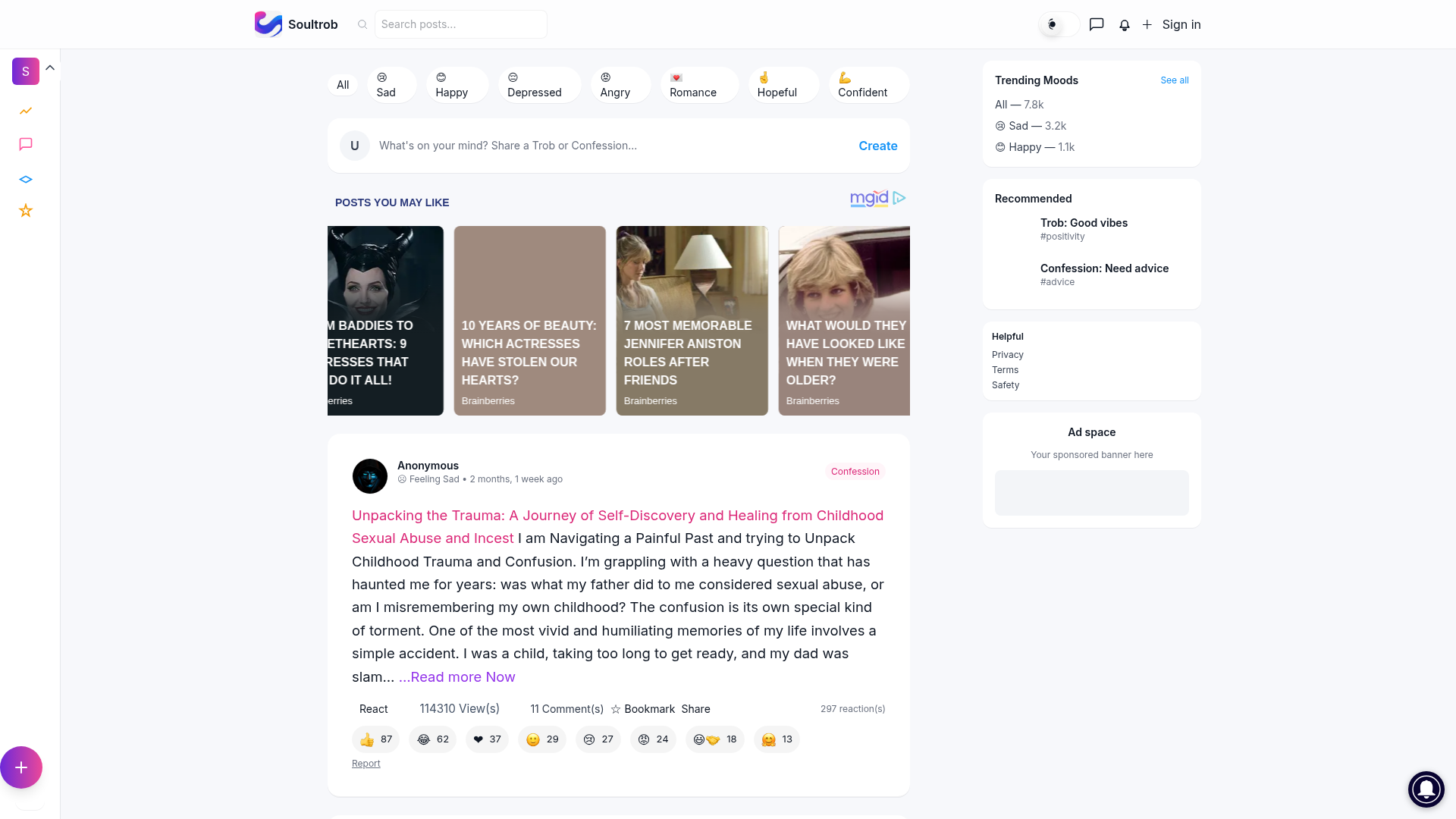 Soultrob stands out as a compassionate online community dedicated to anonymous self-expression and mutual support. It offers a unique space for individuals to unpack their thoughts and connect with others, making it a valuable resource for emotional processing and finding solidarity. Explore Soultrob to share your story and find understanding.