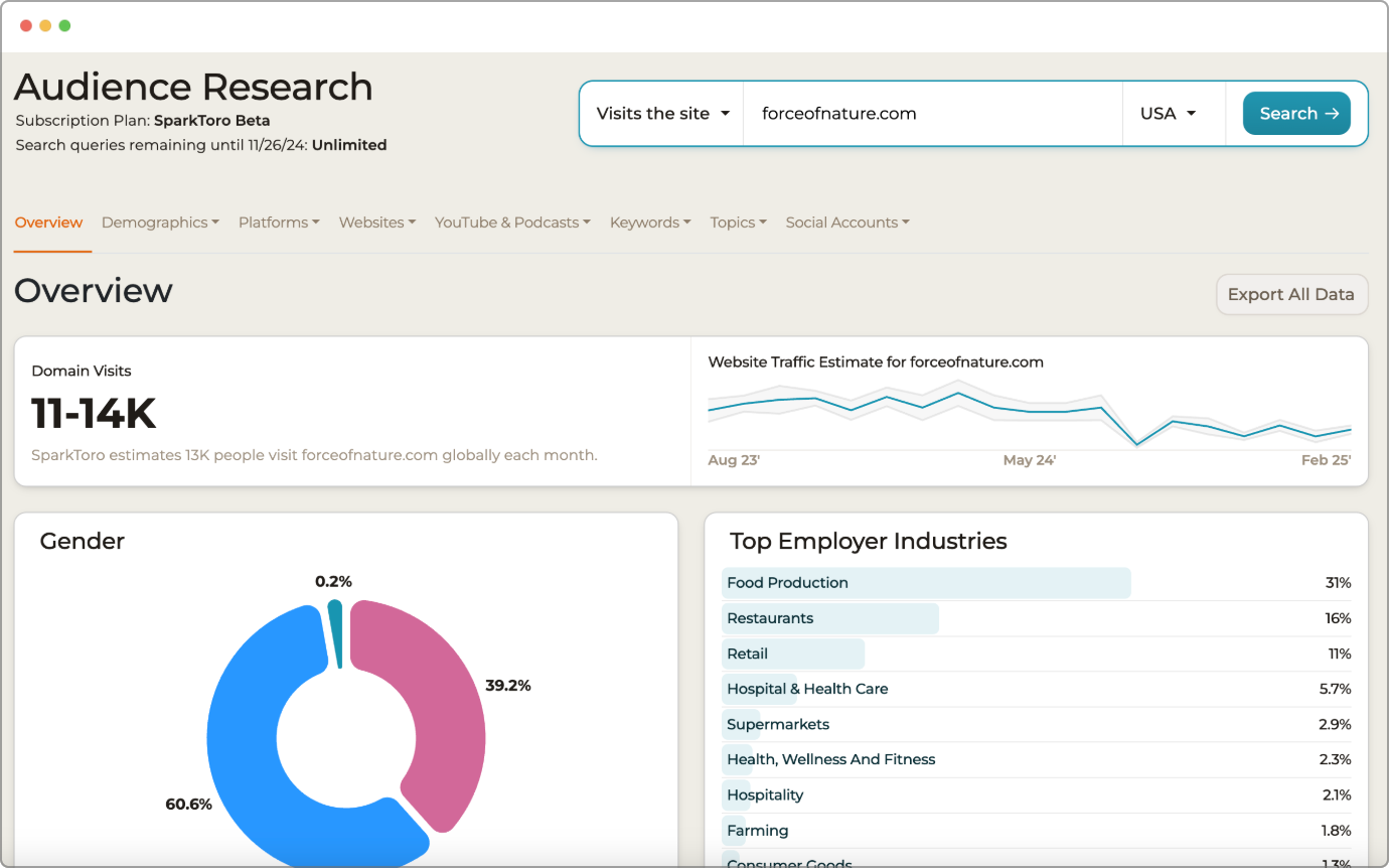 SparkToro is invaluable for any team looking to refine their digital marketing strategy. For content marketers, it pinpoints the exact topics and platforms that resonate, ensuring content creation efforts are highly effective. SEO specialists can leverage audience-specific keywords to gain a competitive advantage, while social media managers can optimize their strategy by understanding preferred platforms and influencers.