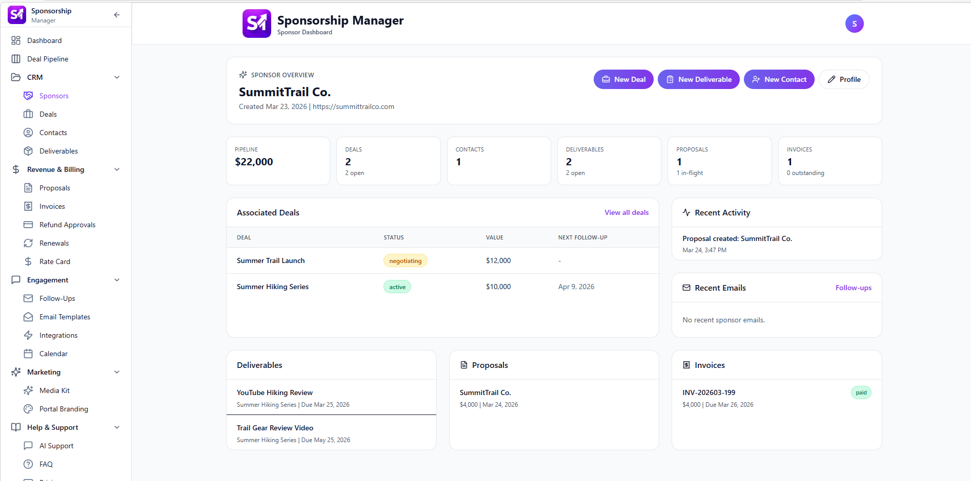 Automatically organize sponsorship conversations, stay on top of deadlines, and never miss a follow-up or payment again.