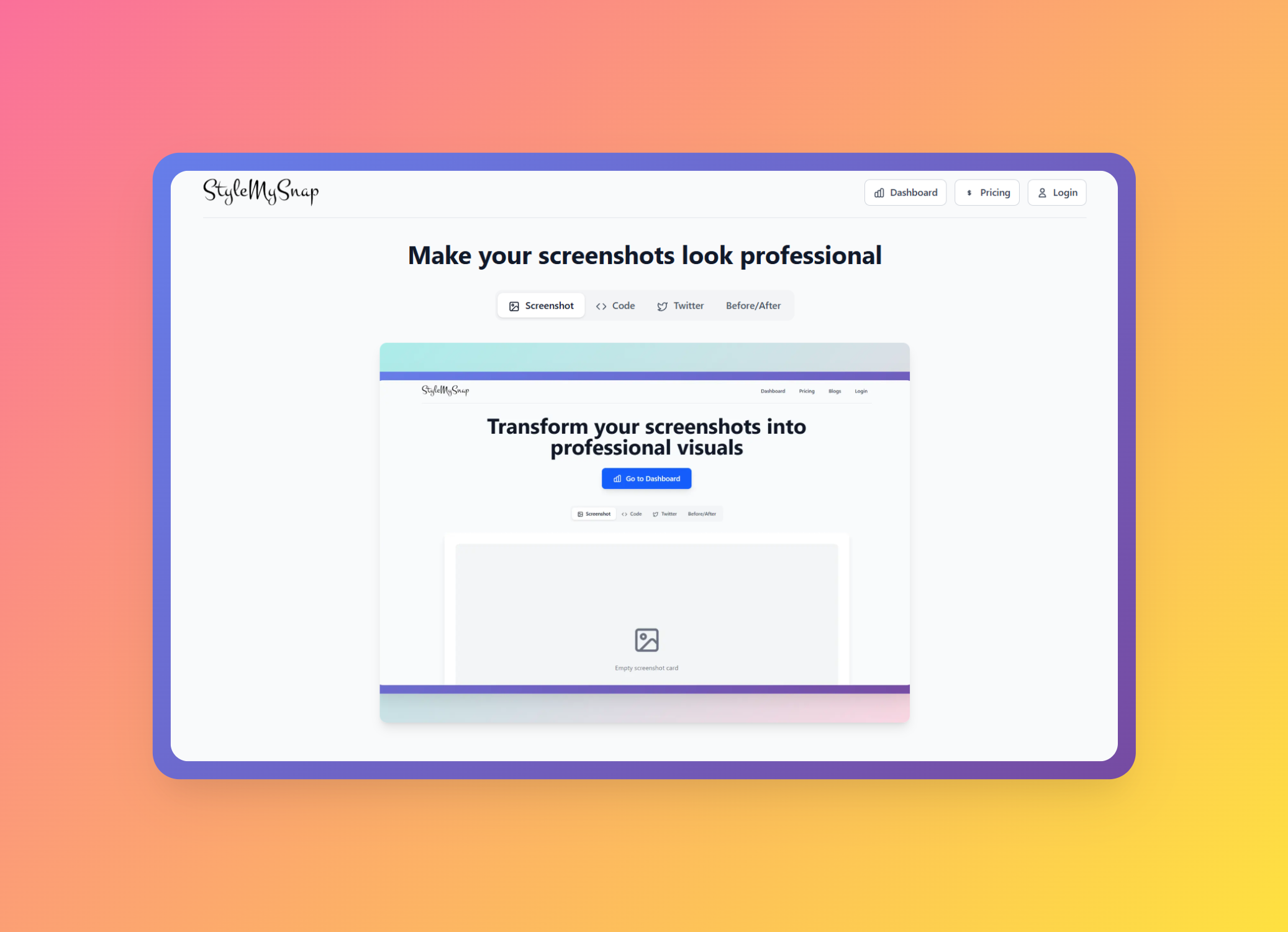 Style My Snap is an intuitive online screenshot beautifier designed to transform ordinary images into professional, eye-catching visuals. It serves as an essential tool for developers, designers, and content creators aiming to elevate their digital presence and make their content stand out on social media and in documentation.