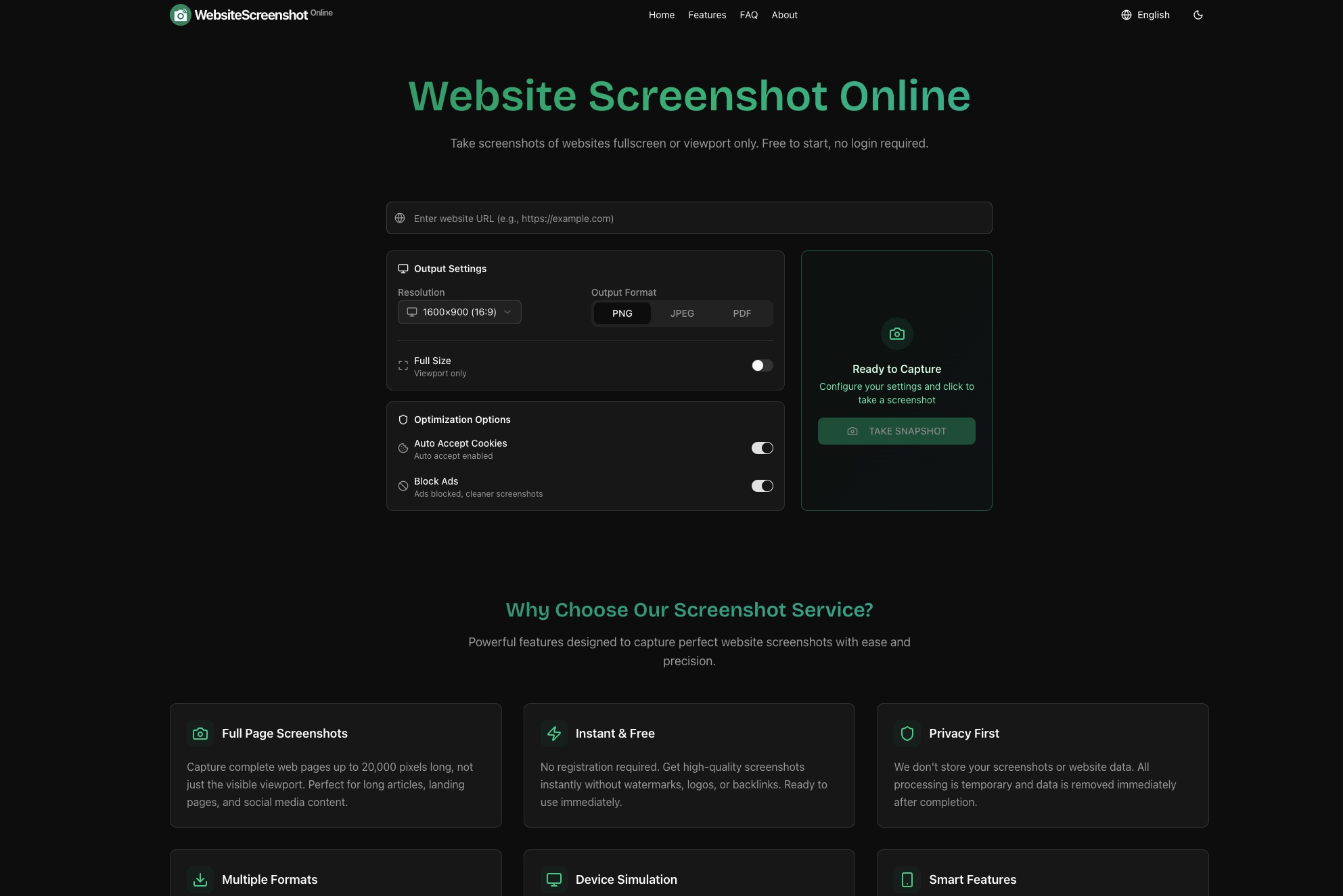 Website Screenshot Online is a privacy-focused tool that allows users to capture screenshots of any publicly accessible website in various resolutions and formats. It offers features like full-page captures, device simulation, and ad blocking to ensure clean and accurate screenshots. The service is completely free, requires no registration, and does not store any data, prioritizing user privacy.